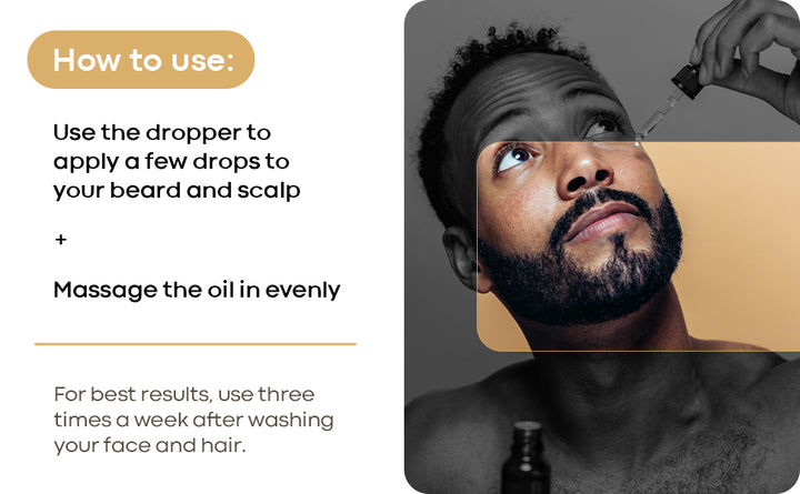 A little goes a long way. Use the dropper to apply a few drops to your beard and scalp, then massage the oil in evenly. For best results, use three times a week after washing your face and hair.